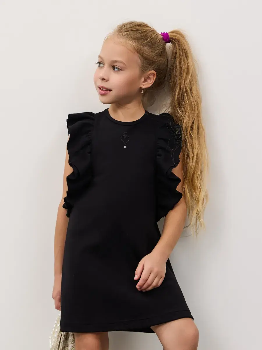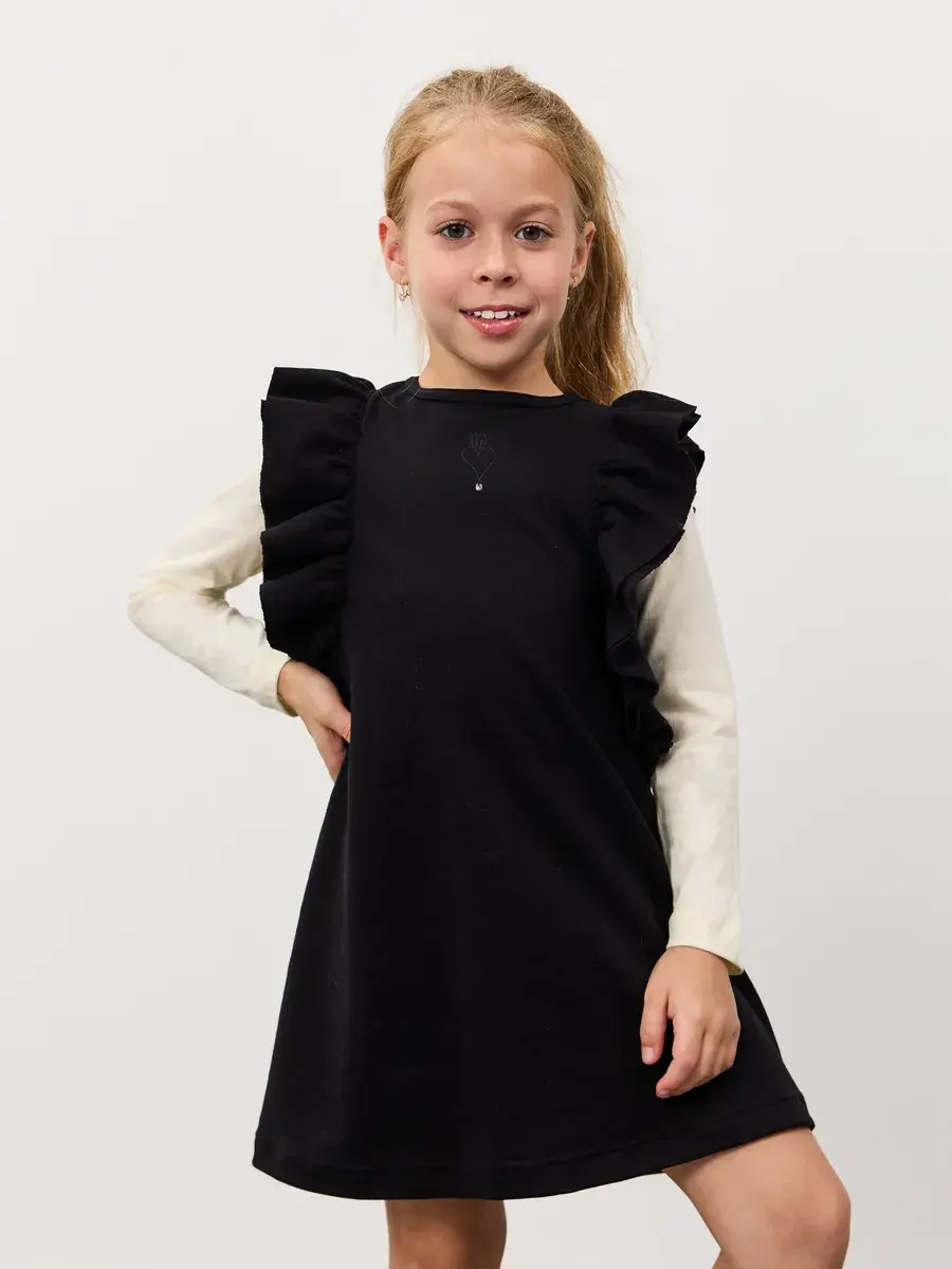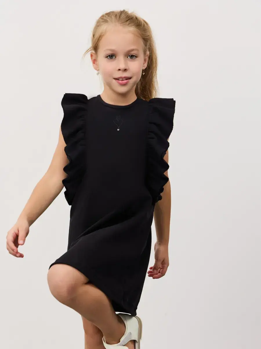 Черный цвет делает его универсальным: платье легко комбинируется с различными аксессуарами и обувью, что позволяет создавать множество стильных образов. Легкость хлопка гарантирует, что платье не будет вызывать дискомфорта, даже если ваша маленькая принцесса проведет в нем целый день.